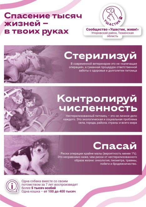 При поддержке активистов упоровского сообщества "Ушастик, живи!" в текущем году спасено, вылечено и пристроено на постоянное место жительства более 70 кошек. Но местные зоозащитники видят свою задачу не столько в помощи всем и каждому, сколько в том, чтобы обратить взоры детей и взрослых в сторону гуманности и ответственности. В листовках сообщества одна из страниц посвящена стерилизации. Кроме того, часть средств пожертвований жителей района тратится на оплату операций по стерилизации котов и кошек.