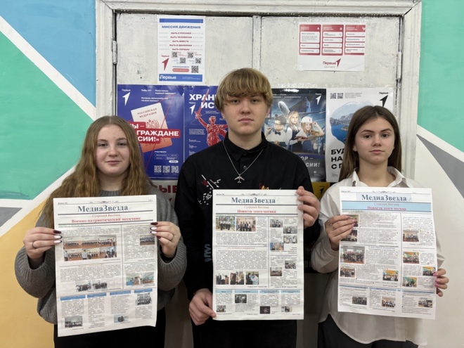 Макет газеты "МедиаЗвезда" разработали выпускница нашей школы Елена Дубровина, учащиеся 10 класса Полина Кормина и Елизавета Брант, а также наш советник директора по воспитанию и взаимодействию с детскими общественными объединениями Светлана Анатольевна Иноземцева. В газете мы рассказываем об акциях, событиях, включая Дни единых действий. Это не только возможность делиться информацией, но и развивать навыки журналистики и командной работы, – сообщил лидер первичного отделения Движения Первых Суерской средней школы Максим Крикуненко.