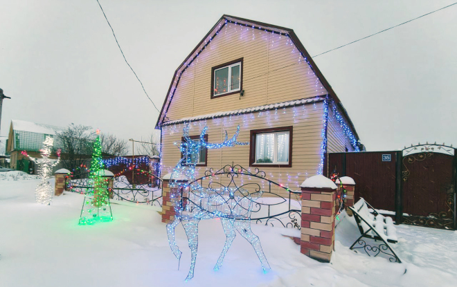 Голубой рогач, белый снеговик и, конечно, красавица ёлочка с зелёными огоньками - радуют всех проходящих и проезжающих мимо усадьбы.