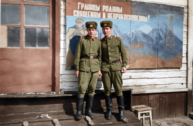 "Границы Родины священны и неприкосновенны"! С таким лозунгом бережно хранится чёрно-белый снимок в армейском альбоме Лазаря Григорьевича Кобелева, на котором изображен он вместе с сослуживцем. Этот снимок очень дорог нашему герою, так как напоминает о срочной службе в Курчумском пограничном отряде, в/ч 2535 Восточного пограничного округа в г. Мары.