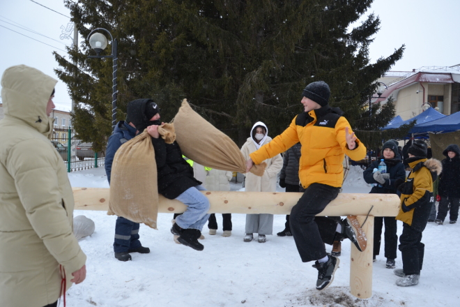 На "поле боя" для битвы на мешках развернулась жаркая схватка – детвора с визгом и смехом сталкивалась друг с другом, демонстрируя ловкость и упорство, присущее сильным молодцам.