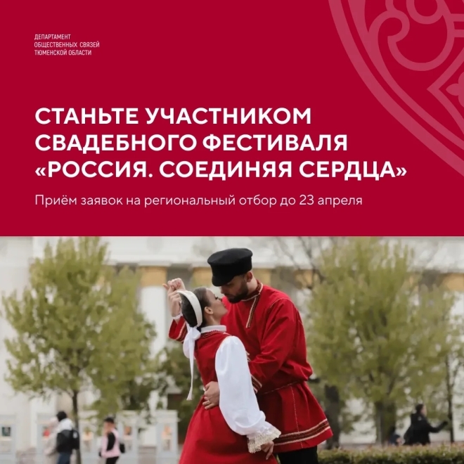 В Тюменской области стартовала заявочная кампания регионального отбора на III Всероссийский свадебный фестиваль "Россия. Соединяя сердца". К участию приглашаются пары, готовые зарегистрировать брак и представить регион на федеральном уровне.